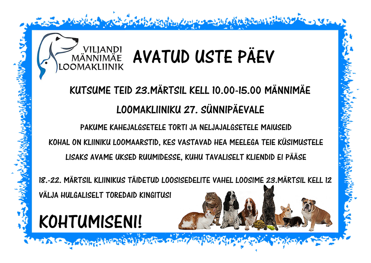 Kutsume teid 23. märtsil kell 10.00-15.00 Männimäe Loomakliiniku 27. sünnipäevale.